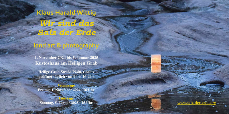 Was Sie erwartet: Schon seit 2022 ist Herr Wittig mit uns im Kontakt, um vielleicht irgendwann einmal einen Salzstein-Tempel in Görlitz aufzubauen. Nun hat er eine Fotoausstellung zur Thematik konzipiert. Es war sein Herzensanliegen, dass die Ausstellung noch in diesem Jahr am Heiligen Grab in Görlitz stattfindet und wir hatten daher nur sehr wenig Zeit, sie gemeinsam mit ihm in kürzester Zeit vorzubereiten. Bei der Eröffnung am Freitag will Herr Wittig eine Einführung in seine Ausstellung geben und unter dem Titel „Die Zeichen der Erde deuten“ über Geomantie und ganzheitliche Tiefenökologie sprechen. Wir würden uns sehr freuen, wenn wir Sie trotz unserer sehr kurzfristigen Einladung zu unseren Gästen zählen dürfen. Der Eintritt zur Ausstellungseröffnung ist kostenfrei! Und für einen kleinen Imbiss soll auch gesorgt sein.