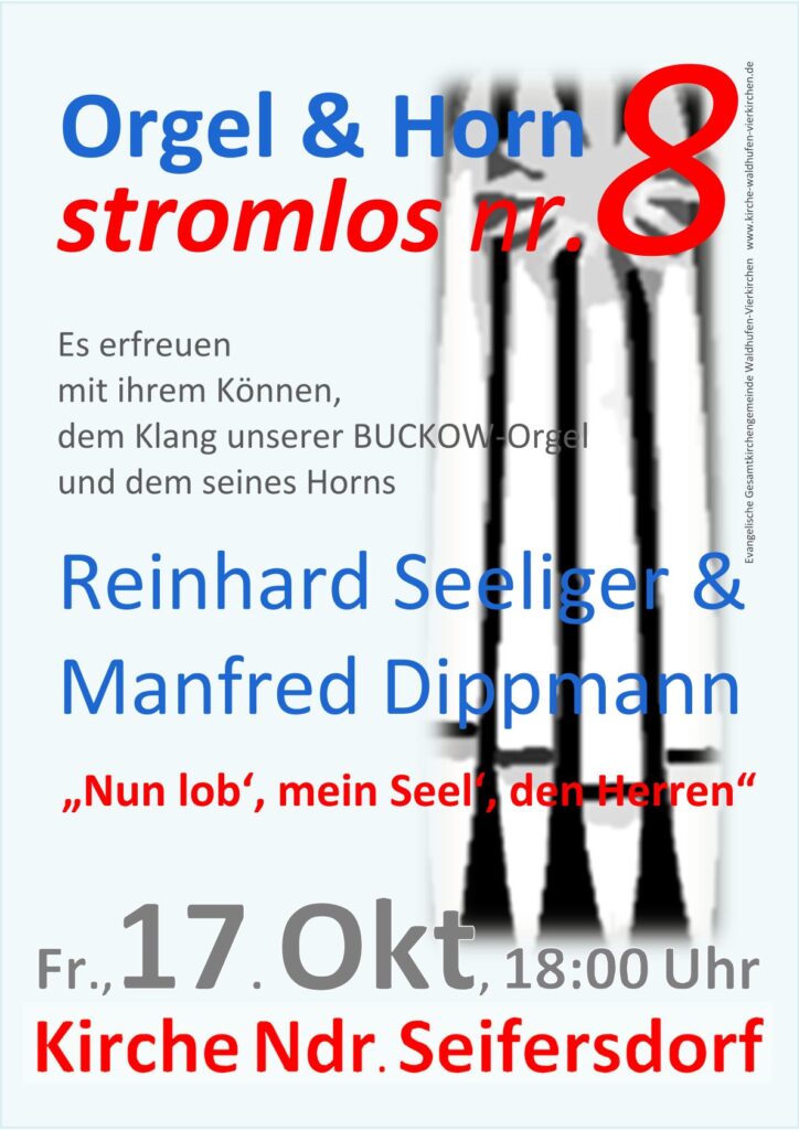 Am Freitag, den 17. Oktober, um 18:00 Uhr treten Konfirmandinnen und Konfirmanden der Gesamtkirchengemeinde Waldhufen-Vierkirchen den Blasebalg der Seifersdorfer Buckow-Orgel. So können die Pfeifen der Orgel – wie zu Zeiten Johann Sebastian Bachs – auch ohne elektrischen Strom erklingen. Auf elektrisches Licht wird an diesem Abend weitestgehend verzichtet.