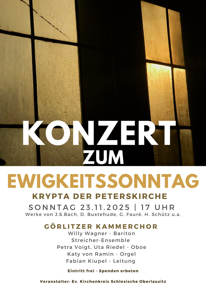 Veröffentlicht am 12. November 202524. November 2025 von PyzikKonzert zum Ewigkeitssonntag am 23. November 2025 um 17:00 Uhr in der Krypta der Evangelischen Peterskirche Görlitz teilen drucken