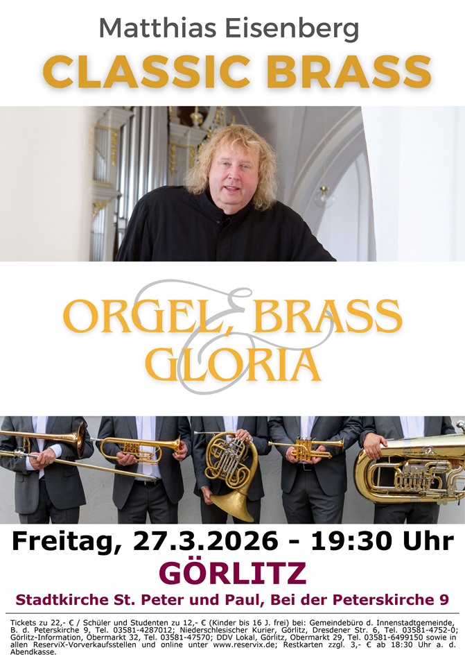 Ein außergewöhnliches Konzerterlebnis erwartet das Publikum am 27. März 2026 um 19:30 Uhr in der Stadtkirche St. Peter und Paul. Unter dem Titel „Orgel, Blech & Gloria“ musizieren das renommierte Blechbläserensemble CLASSIC BRASS und der international bekannte Organist Matthias Eisenberg gemeinsam.